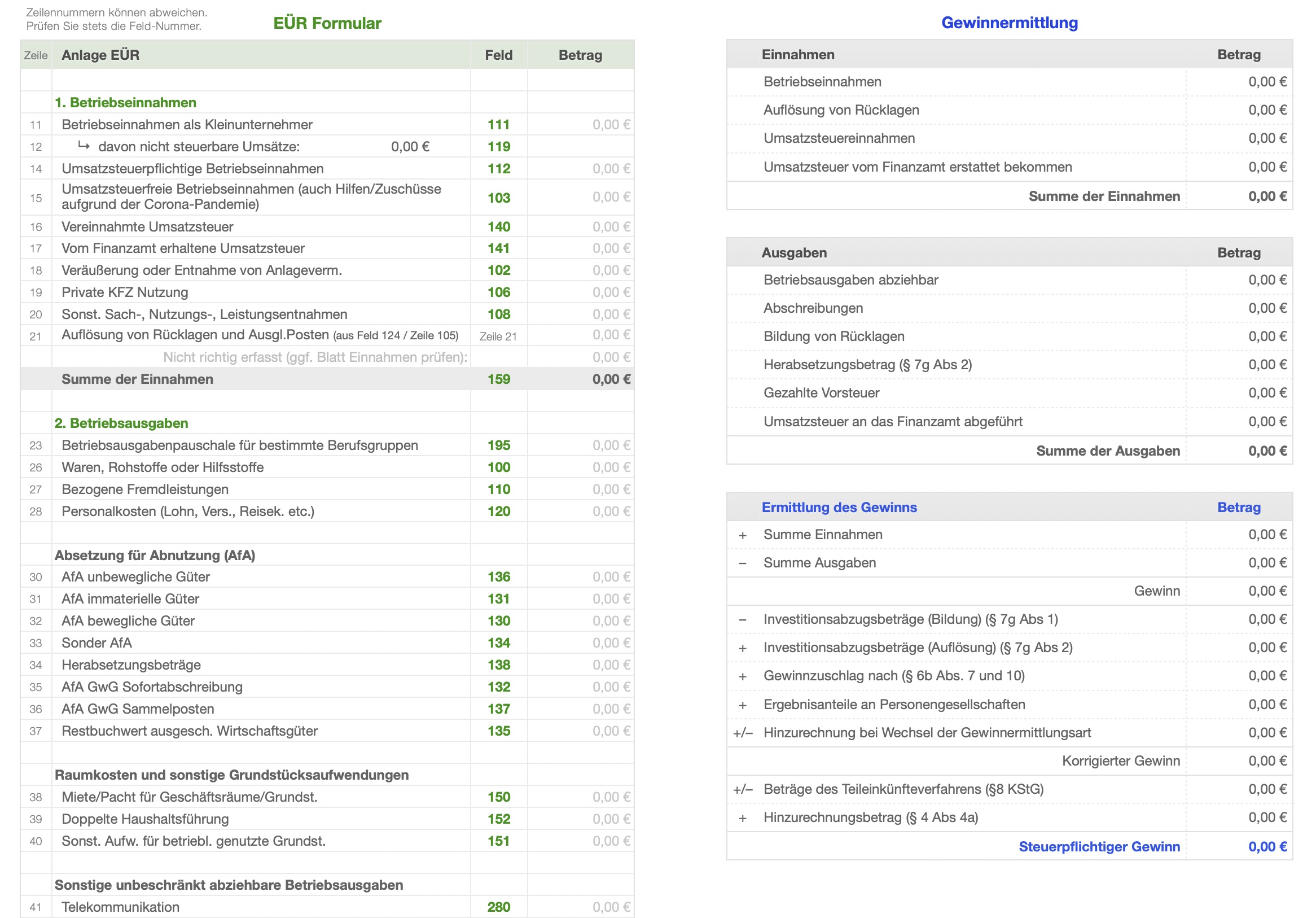 - Ermittlung des Gewinns nach dem Schema der "Anlage EÜR" (*)