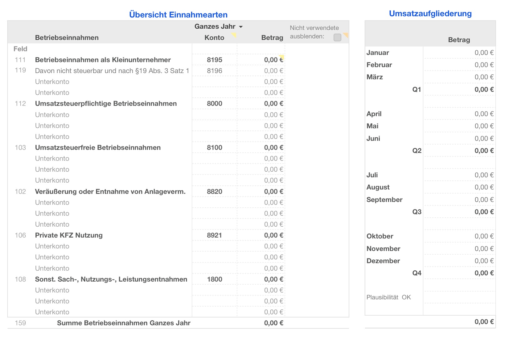 - Konten für Einnahmen und Ausgaben nach dem EÜR-Formular und dem Datev SKR 03