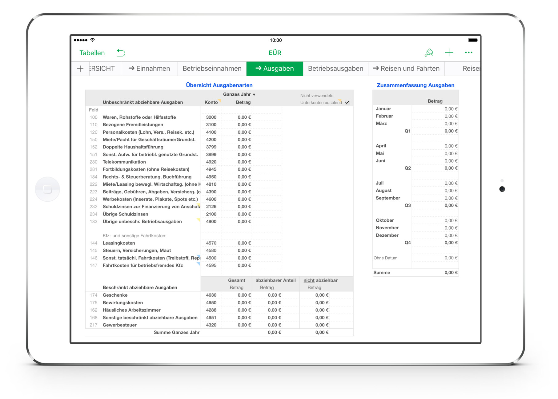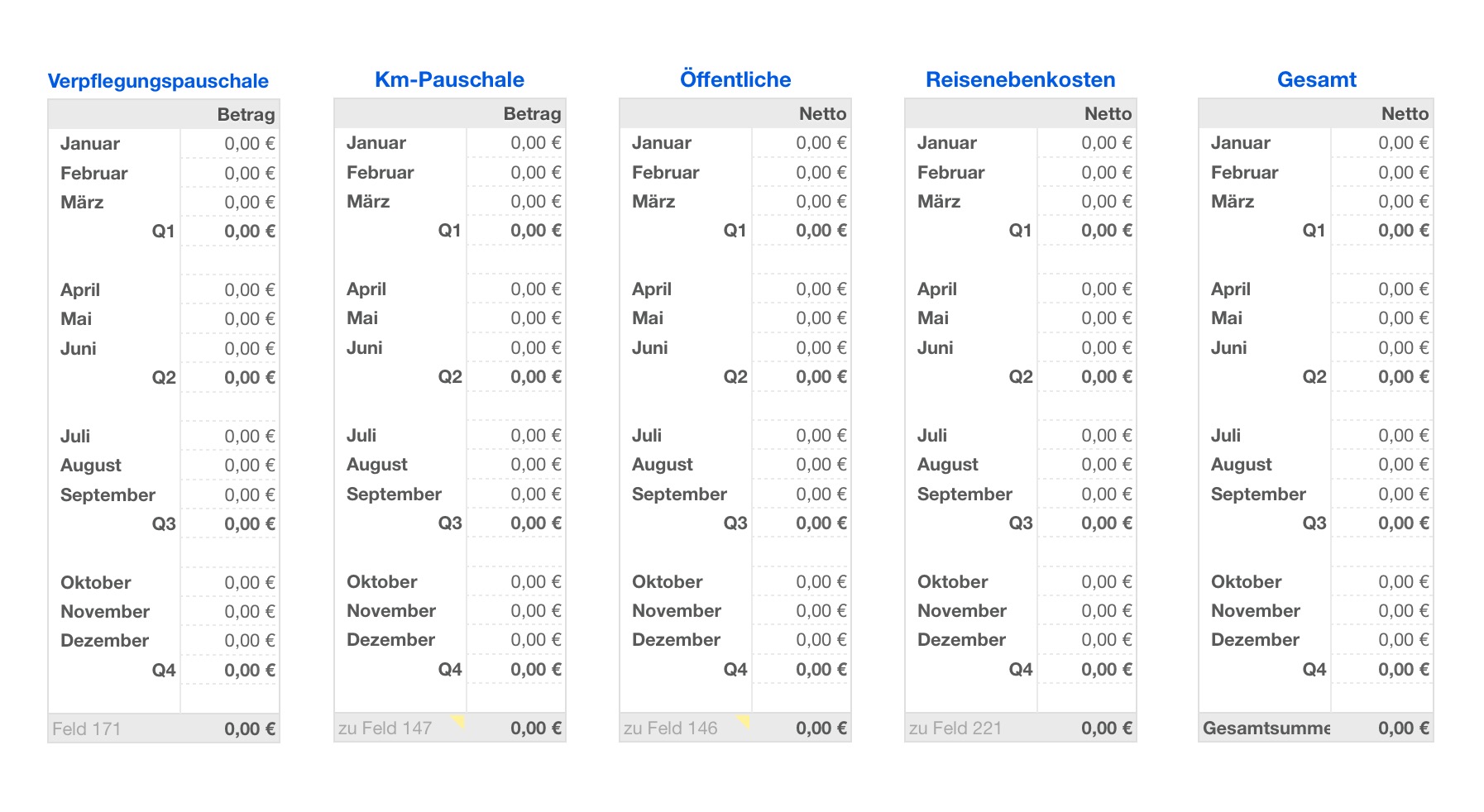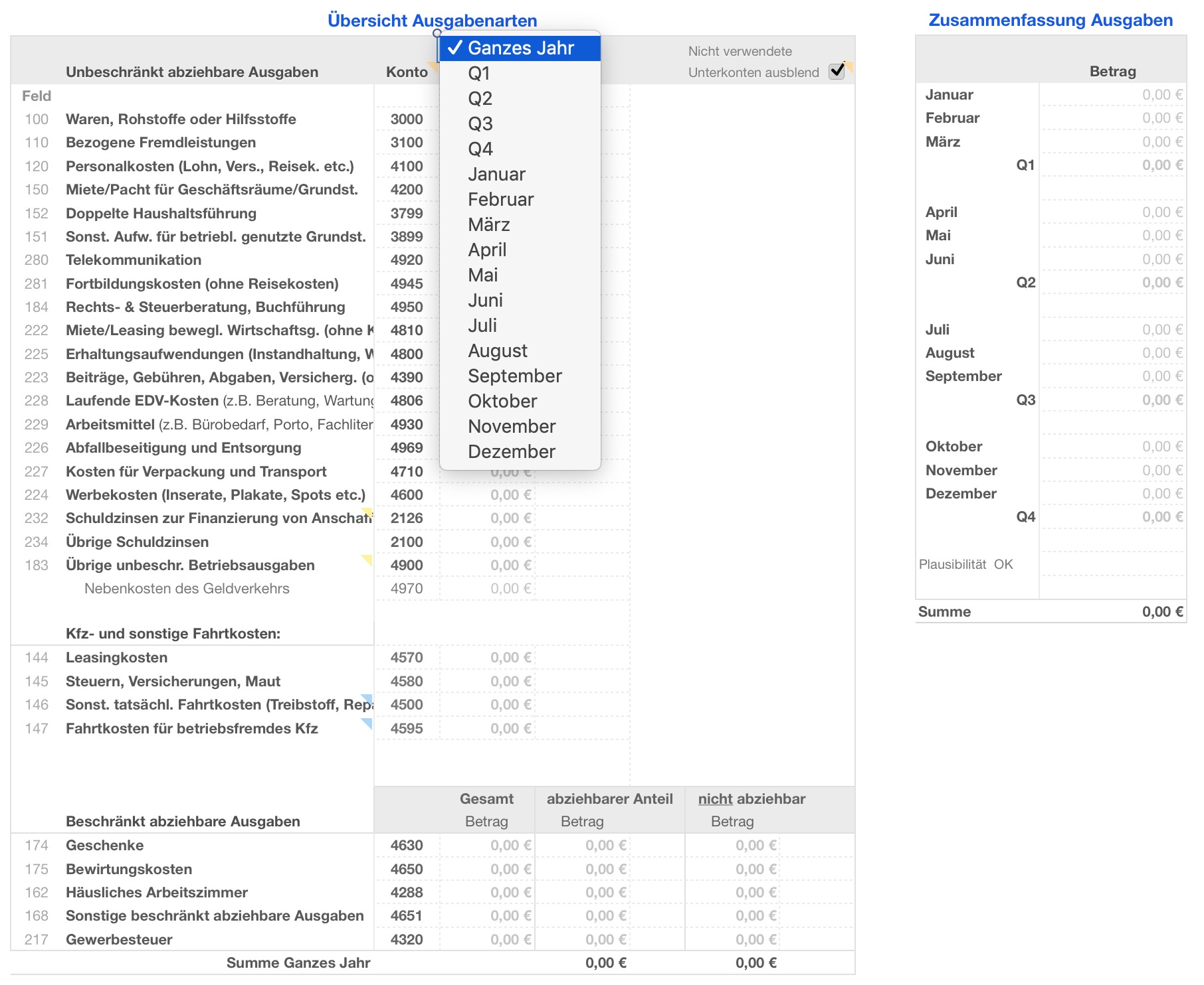 - Zusammenfassung der Einnahmen, Ausgaben und Reisekosten in Monats- und Quartalssummen
