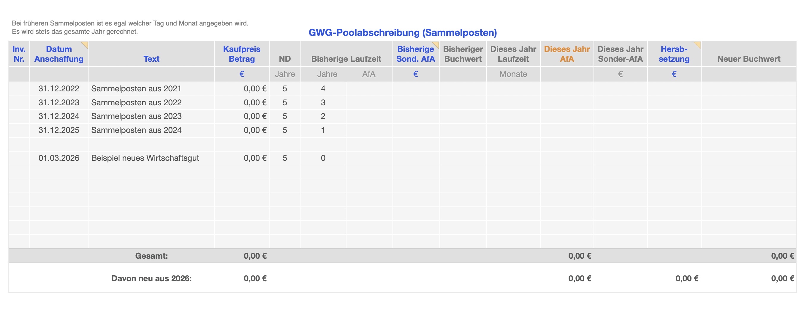 - Listen und AfA-Berechnung für GWG Sofortabschreibung und Sammelposten, bewegliche, unbewegliche und immaterielle Wirtschaftsgüter