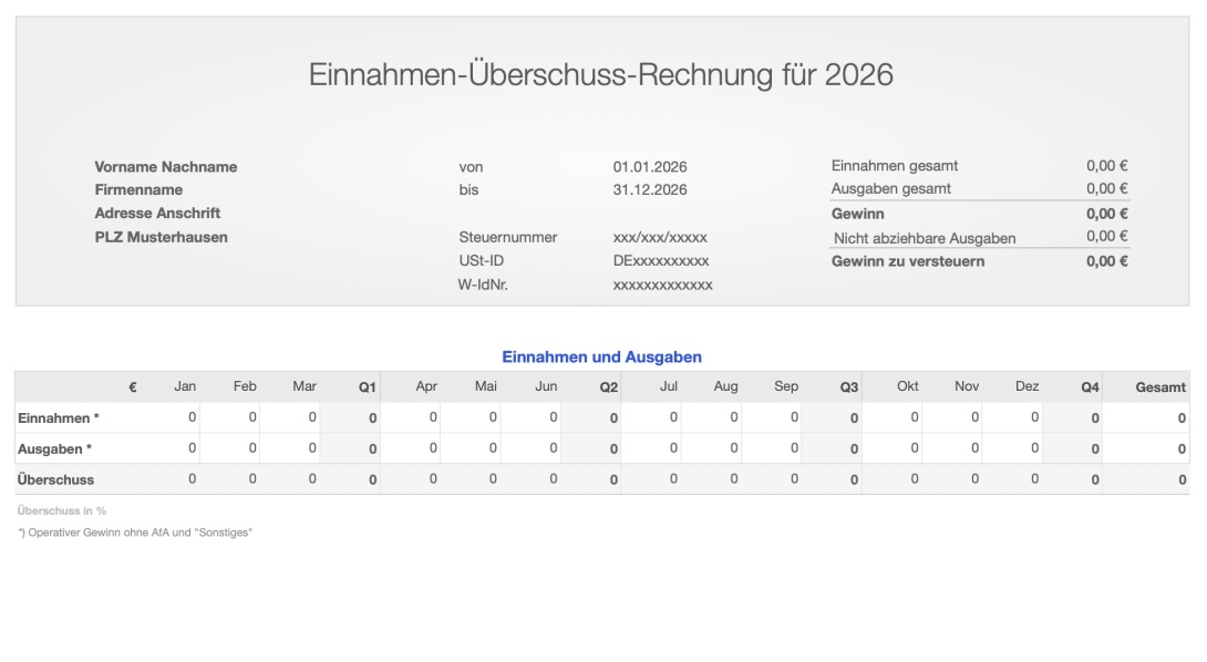 Mit der EÜR Vorlage erfassen Sie das Geschäftsjahr 2026 einfach und übersichtlich in Numbers auf dem Mac, iPad oder iPhone ohne Umsatzsteuer (Kleinunternehmer). Die EÜR mit USt finden Sie hier.