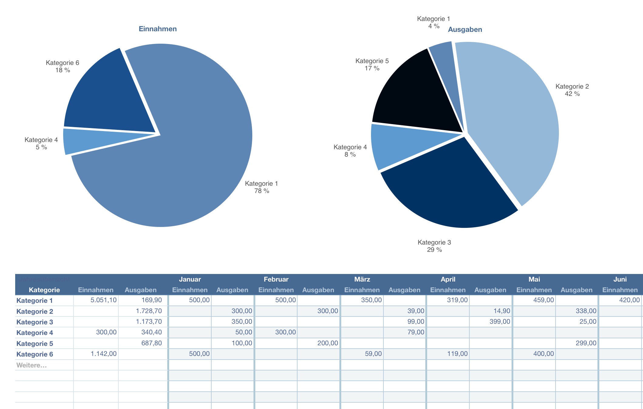 • Detaillierte Auswertung: Einnahmen und Ausgaben je Kategorie pro Monat