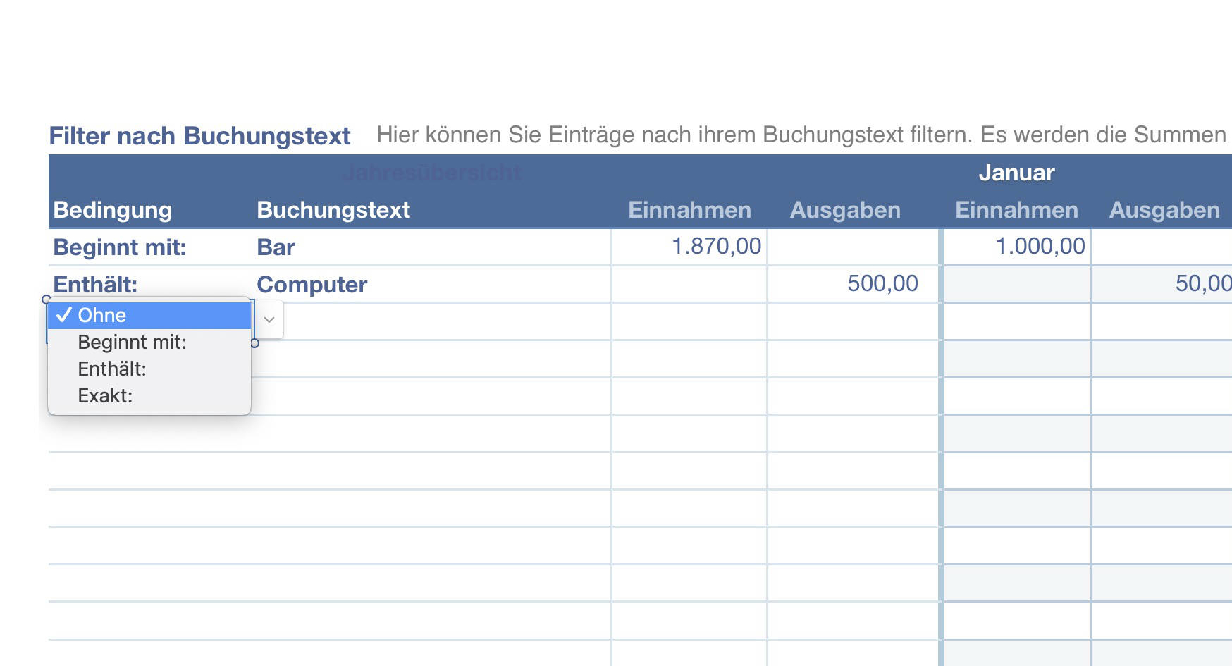 Filter nach Buchungstext: In der Zusammenfassung können Sie nach Wörtern oder Wortkombinationen filtern und die Summen über die Monate hinweg anzeigen lassen. Z.B. Filtern nach dem Wort "Spende" zeigt die Summen aller Einträge mit diesem Wort an wie Spende, Spenden, Spende an X, Spende von Y, etc. Es kann gefiltert werden mit der Bedingung "Beginnt mit", "Enthält" oder "Exakt" (Buchungstext muss dem Suchtext exakt übereinstimmen).