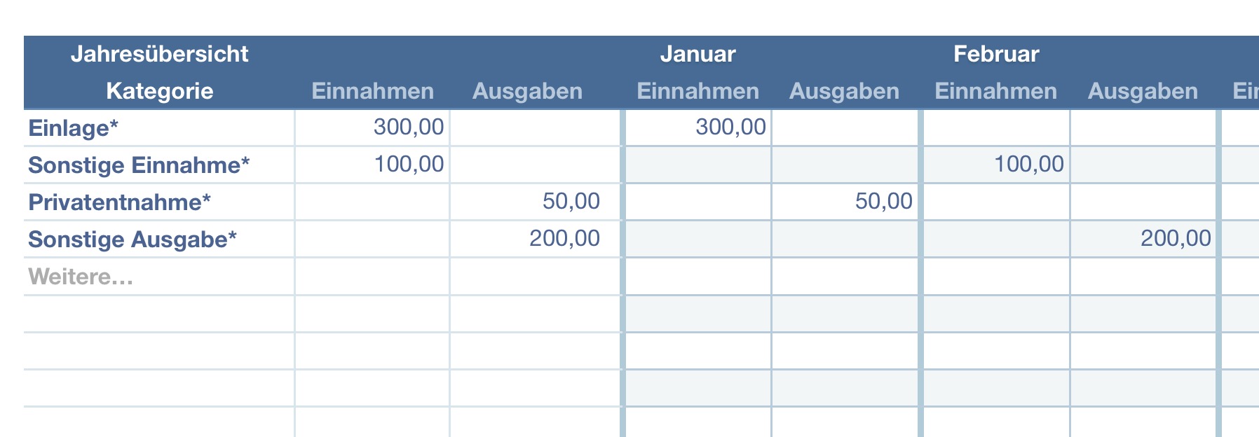 Es steht ebenfalls eine detailliertere Auswertung nach Kategorien und Monaten zur Verfügung. Kategorien können verwendet werden, um eine bessere Übersicht zu erhalten. In der Auswertung stehen dafür 15 Zeilen für je eine Kategorie zur Verfügung. Es können weitere hinzugefügt werden. Tragen Sie dort Ihre Kategorien oder Konten ein, die Sie bei der Erfassung verwenden. Diese werden dann nach ihrer monatlichen Summe dargestellt.