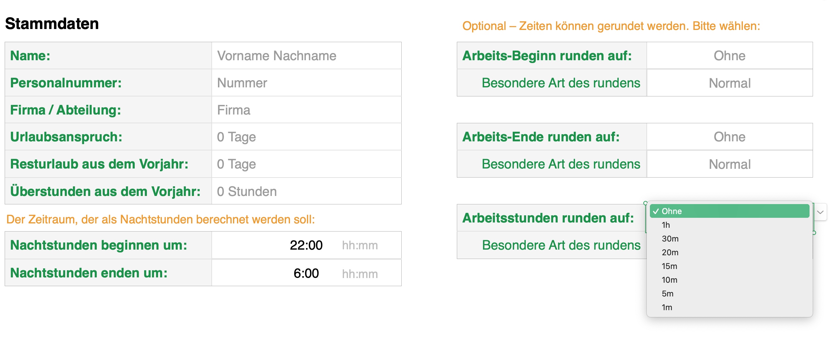 Runden: Die Zeiten können gerundet werden. Sowohl die Beginn- als auch die End-Zeiten sowie die Tagesarbeitszeit. Diese Einstellung kann in den Stammdaten gesetzt werden.