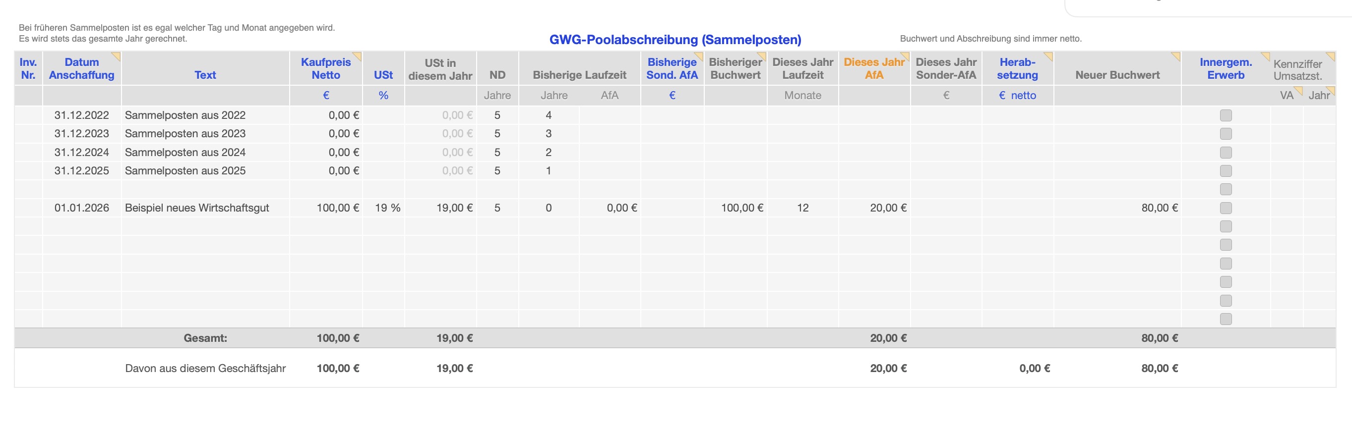• Automatische AfA- und Buchwertberechnung für GWG Sofortabschreibung, GWG Sammelposten und Wirtschaftsgüter