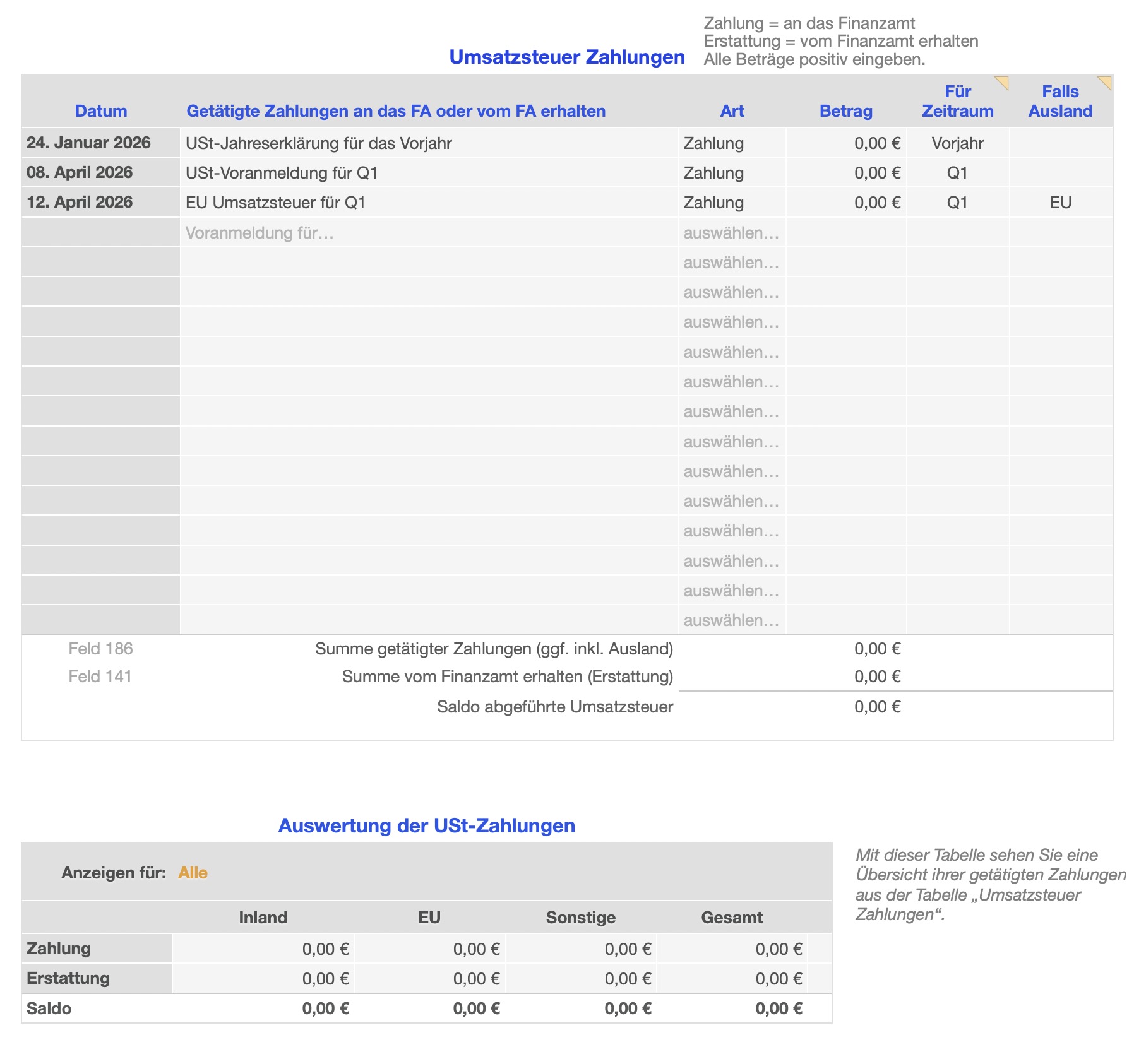 • Umsatzsteuer Zahlungen und -Voranmeldung mit Ausfüllhilfe für das Steuerformular