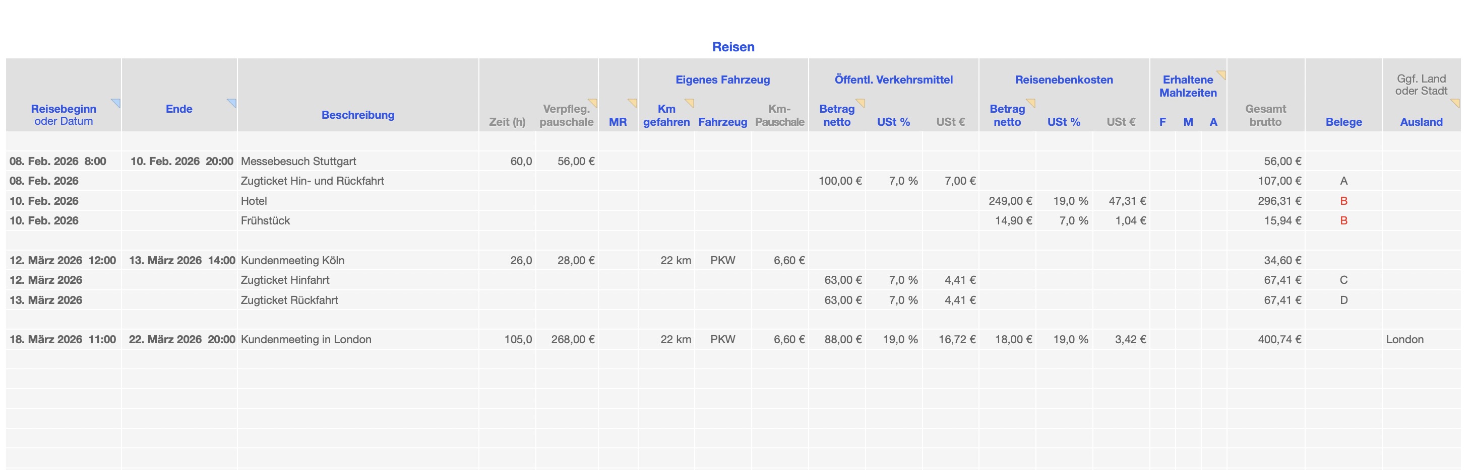Ihre Einnahmen, Ausgaben, Reisen etc. geben Sie in die jeweiligen Tabellenblätter ein. Die Zwischen- und Endsummen werden daraus errechnet und für Gewinnermittlung des Geschäftsjahres ausgewertet. Geschäftsjahr ist jeweils das Kalenderjahr.