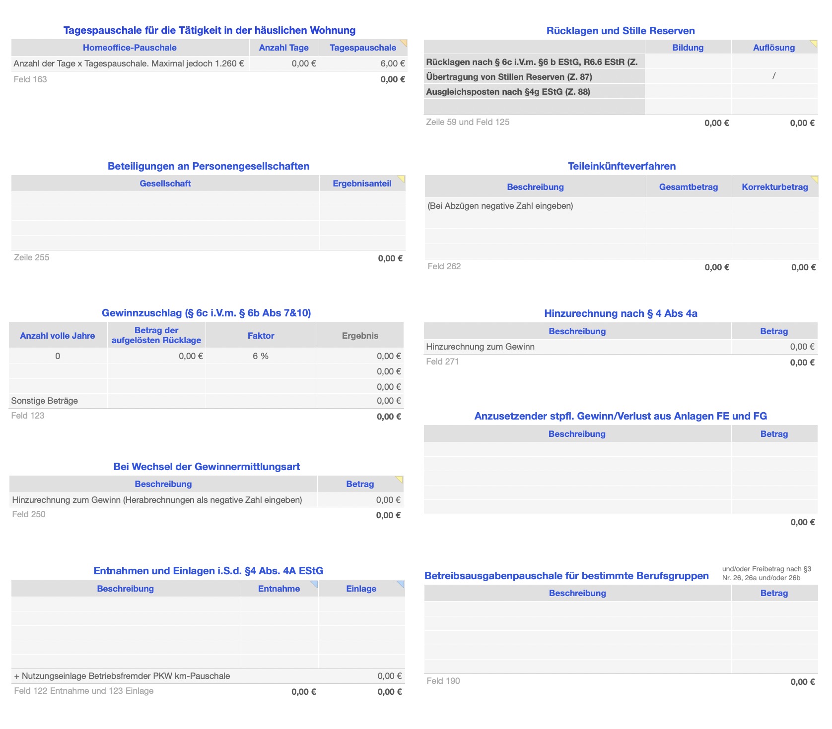 • Sonstiges: Gewinnzuschlag, Rücklagen, Beteiligungen, Teileinkünfte, Einlagen etc.