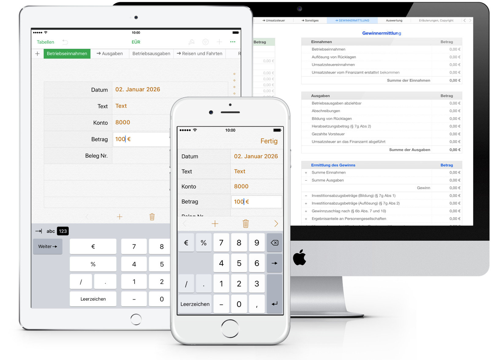Beim Einsatz auf dem iPad und iPhone stehen zusätzliche Eingabeformulare für die Einnahmen, Ausgaben und Reisen zur Verfügung, wodurch die Eingabe erleichtert wird. Numbers auf dem iPhone oder iPad benötigt stets die aktuelle Version von iOS.