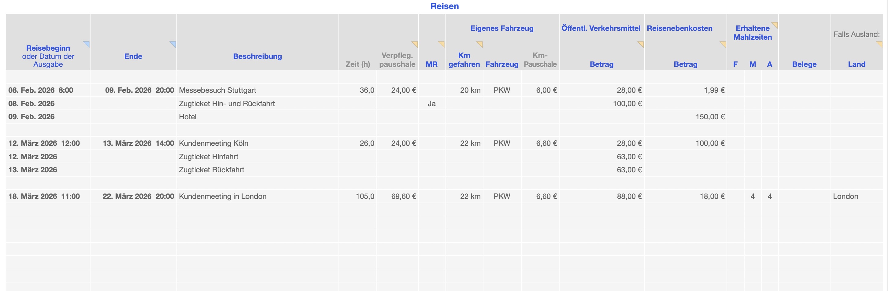 • Automatische Berechnung der Reisedauer, Fahrtkosten und Verpflegungspauschale