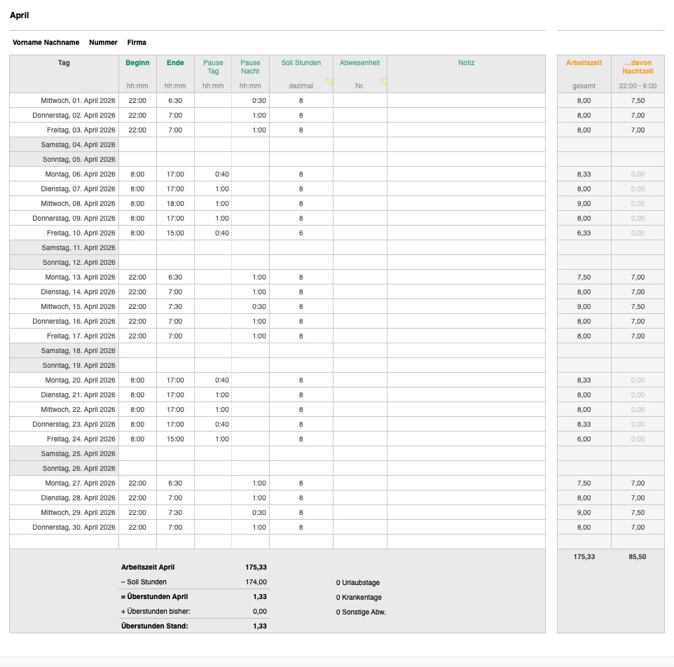 Die tägliche Arbeitszeit wird mit der anteiligen Nacht-Zeit errechnet. Die Überstunden im aktuellen Monat sowie die im Jahr aufgelaufenen Überstunden sind auf jedem Blatt für den jeweiligen Monat dargestellt.